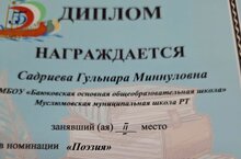 9.04.2024 года преподаватель татарского языка и литературы, библиотекарь Г.М Садриева выступила в номинации «Поэзия» и была награждена Дипломом I степени на I региональном творческом конкурсе учителей, библиотечных работников, воспитателей «Творческие страницы Факиля Сафина», проводимой в средней общеобразовательной школе № 55 г. Набережных Челнов.