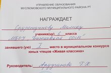 16.04 на базе МСОШ имени Г.Тукая прошел муниципальный этап республиканского конкурса чтецов "Живая классика". Ученица 6 класса Сруретдинова Малика заняла 1место.Учитель:Ардуганова Г.Х.