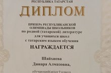 Мәктәбебезнең 9 сыйныф укучысы Шәйхиева Динара татар теле һәм әдәбиятеннән республикада үткән олимпиадада призер булды.Укытучысы Садриева Гөлнара Миңнулла кызы.