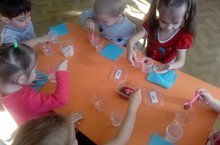 Дети второй младшей группы исследуют растворимость песка и соли в воде.