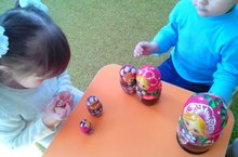 Беренче кечкенәләр төркемендә балаларны халык иҗат иткән уенчык-матрешка белән таныштыру. Матрешканы ачарга һәм дөрес итеп җыярга күнектерү.Дети первой младшей группы знакомятся с народной игрушкой - "Матрёшка". -