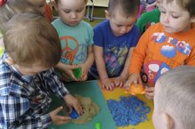 Вот они наши самые маленькие исследователи. Дети первой младшей группы изучают свойства кинетического песка: влажный, сухой, сыпучий и т.д. Паралельно идёт развитие речи и обогащение словарного запаса.