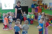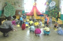 Дети первой младшей группы играют в подвижную игру "Зайчик в домике". Задачи игры: упражнять детей в прыжках; учить сильно отталкиваться от пола; побуждать действовать по сигналу.