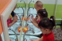 Беренче кечкенәләр төркеме балалары белән кулларны сабынлап юарга өйрәнәбез.