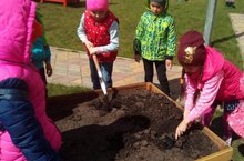 Мәктәпкә әзерлек төркеме балалары чәчәклек җирен йомшарталар. Петуния утыртырга вакыт җиткәнен зур түземсезлек белән көтәләр.