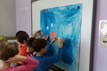 Детская коллективная работа ко Дню космонавтики "Разноцветные планеты".Исполненным волшебства,ярким и красочным видят космос воспитанники нашего детского сада..