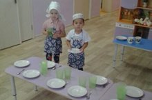 Кечкенәләр дә дежур булырга ойрәнәләр.Балалар бик теләп ипи, салфетка савытларын куялар.