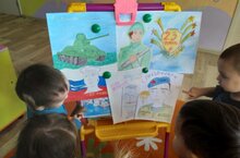 Ватанны саклаучылар көне уңаеннан кечкенәләр төркеме балалары белән кем ул солдат, нишли, ничек киенә, ниләр башкарганы турында әңгәмә үткәрдек. Хәрби техника белән таныштык. Әтиләребезгә бүләк әзерләдек.