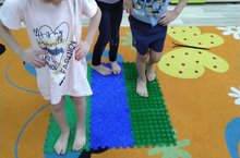 Дети подготовительной группы каждое утро собирают напольный модульный коврик - пазл и босиком по нему ходят. При этом происходит точечный массаж рефлекторных зон стопы. Это профилактика плоскостопия и образования мазолей.