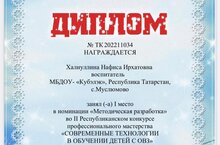 Тәрбиячебез Хәлиуллина Нәфисә Ирхат кызы "Сәламәтлекләре чикле балаларны укытуда заманча технологияләр" II Республика һөнәри осталык конкурсының 1 нче дәрәҗә дипломына лаек булды.