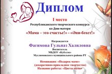 Воспитатель Фагимова Гульназ Халиловна стала дипломантом республиканского творческого конкурса ко Дню матери "Мама-это счастье!" - "Әни-бәхет!", в номинации "Подарок маме."