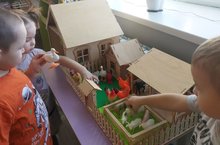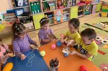 Балаларны күргәзмәгә җеп әйләндерергә, вак моториканы үстерергә һәм ике кул белән башкару сәләтен өйрәтү максатыннан , зурлар төркеме балалары белән бер үк вакытта дорисовка элементлары булган "кәлтә" ясадылар.