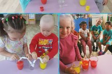 В средней группе эксперименты с водой: "Плавающее яйцо" (с солью), "Шагающие цвета" (с красками), "Пузыри в воде". Проведя разные эксперименты с водой, мы узнали много интересного о воде, и что можно с её помощью увлекаться разными экспериментами.
