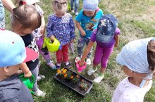 “Ләйсән” балалар бакчасының икенче кечкенәләр төркеме балалары тәрбияче апалары белән бергә чәчәкләрне карыйлар: су сибәләр, җирне йомшарталар, чәчәкләрнең исемнәрен истә калдырырга тырышалар.
