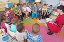 Матур гадәтләр турында китаплар уку көне уңаеннан икенче кечкенәләр төркемендә “Казлар- аккошлар” рус халык әкияте укылды. Әкияттә тасвирланган геройларның гамәлләре аша, бер-береңә һәрвакыт ярдәм итәргә кирәклеге турында әңгәмә үткәрелде.