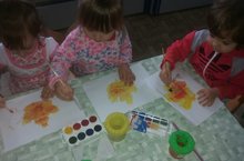 “Иҗади сәнгать” белем бирү өлкәсе, рәсем эшчәнлегендә беренче кечкенәләр төркеме балалары сары төстә кунакта. Алар көзге яфракларны кызыл, сары төскә буяп яңа төс барлыкка китерәләр.