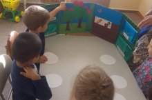 Икенче кечкенәләр төркемендә балаларны төрле яктан үстерү өчен барлык шартлар тудырылган. Балаларның иң яраткан эшчәнлекләре: рәсем, әвәләү, кисеп ябыштыру. 10 октябрь көнне кисеп ябыштыру эшчәнлегендә балалар, тәрбиячеләре өйрәткәнчә, геометрик фигуралардан яшелчә, җиләк-җимеш җыеп ябыштырдылар.