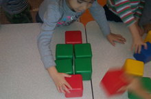 Балаларның игътибарын, күзәтүчәнлекләрен, үрнәк буенча эшли белүләрен ныгыту максатыннан, икенче кечкенәләр төркемендә иң гади математик күзаллауларын формалаштыру эшчәнлеге барышында “Гади кубиклардан бизәкләр төзү” уен- күнегүе үткәрелде. Уен барышында балалар үрнәк рәсемгә карап кубиклардан бизәкләр төзеделәр.