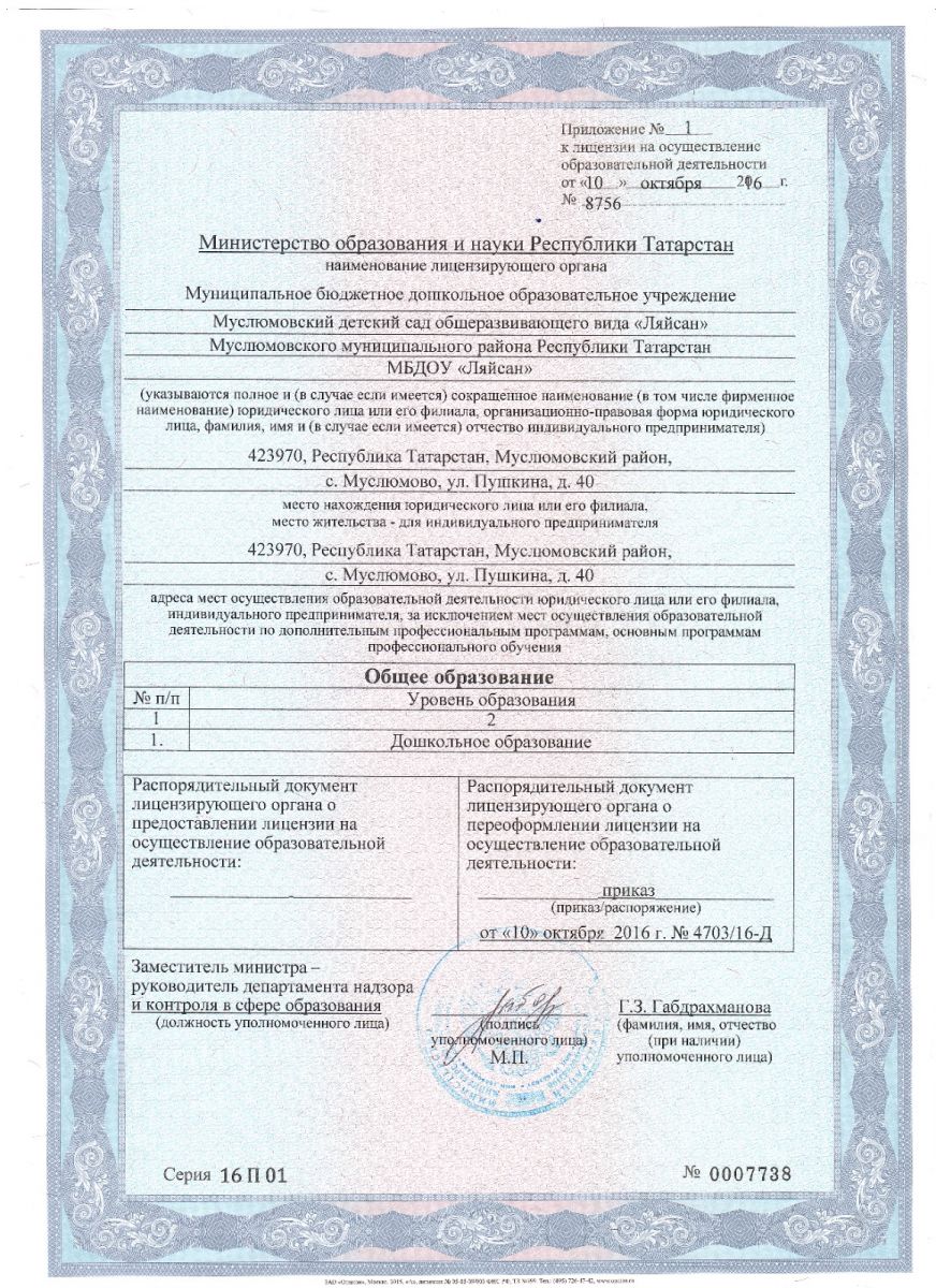 Наименование на татарском языке: Татарстан Республикасы Мөслим муниципаль районы муниципаль бюджет мәктәпкәчә белем бирү учреждениесе Мөслим авылы «Ләйсән» гомуми үстерелешле балалар бакчасы.