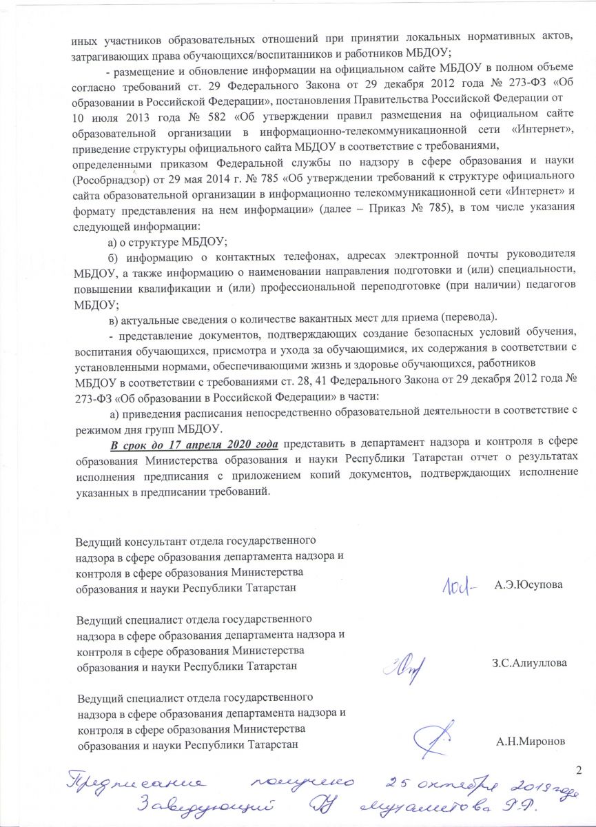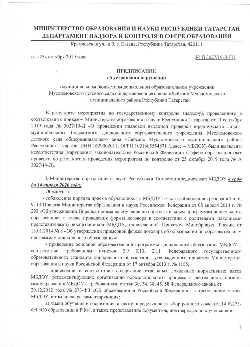 Отчет МБДОУ "Ляйсан" об исполнений предписания департамента надзора и контроля в сфере образования
