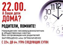 Убедительно просим Вас контролировать времяпрепровождение ваших детей! Нахождение их на улице в ночное время небезопасно! Во избежание неприятностей и наложения штрафов следует позаботиться о том, чтобы не позднее 22.00 ваши дети находились дома.
