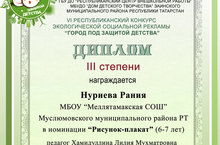 Участвовали в VI республиканском конкурсе экологической социальной рекламы "Город под защитой детства" в номинации "Рисунок-плакат". Воспитанница дошкольной группы Нуриева Рания получила диплом 3 степени, а первоклассница Зулунова Ирода сертификат учасника.