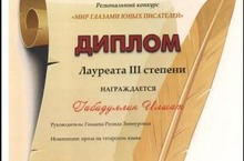 Ученик 6 класса Габидуллин Илшат принял участие в региональном конкурсе "Мир глазами юных писателей", посвященном Году культуры и награден дипломом лауреата III степени. Руководитель: Гимаева Р.З.