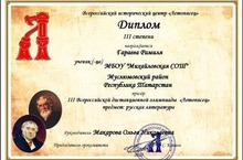 Ученица 5 класса Гараева Рамиля - призер III Всероссийской дистанционной олимпиады "Летописец" награждена дипломом, ученица 9 класса Шаймарданова Наиля -участник III Всероссийской дистанционной олимпиады "Летописец" по предмету литература.Руководитель:Макарова О.Н.
