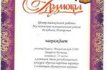 Ученица 8 класса Сарварова Н.заняла I место в районном этапе республиканского конкурса "Русская народная игрушка" в номинации "Игрушка из подручных материалов" (руководитель Сарварова Р.Г.), ученица 8 класса Миннахметова А. -I место и ученик 7 класса Закиров Р. II место - в номинации "Ярмарочная игрушка" (руководитель Хорев В.В.).