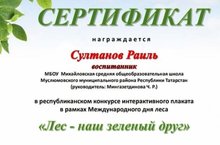 Воспитанник младшей дошкольной группы МБОУ Михайловская СОШ принял участие в республиканском конкурсе интерактивного плаката в рамках Международного дня леса "Лес - наш зеленый друг", был награжден сертификатом. Руководитель: Мингазетдинова Ч.Р.