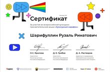 Туган телләр һәм халыклар бердәмлеге елы кысаларында 2 нче сыйныф укучысы Шәрифуллин Рүзәл бөтенрәсәй "Мәдәни марафон" акциясендә катнашып сертификат белән бүләкләнде.