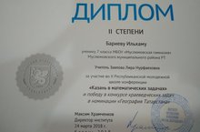 Ученик Муслюмовской гимназии Бариев Ильхам принял участие во II Республиканской молодежной школе-конференции "Казань в математических задачах" и одержал победу в номинации "География Татарстана". Руководитель - учитель математики нашей гимназии Заялова Л.Р. Поздравляем!