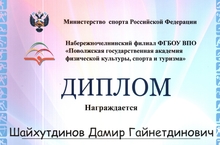 Учитель физкультуры Муслюмовской гимназии Шайхутдинов Дамир Гайнетдинович занял первое место в XIV Межвузовской конференции студентов,аспирантов, молодых ученых "Теоретические и практические аспекты физической культуры, спорта и туризма" по направлению "Система спортивной подготовки в игровых видах спорта: проблемы, решения, инновации".
