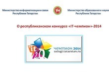 Дорогие ребята, уважаемые родители! Сообщаем вам о том, что стартовал новый этап республиканского конкурса "IT -Чемпион". Его новые сроки - с 15 марта по 10 декабря 2014 года. Регистрируя новых пользоваталей на портале Государственные услуги Республики Татарстан, разъясняя им удобства услуг в электронном виде и привлекая к осуществлению электронных платежей, вы имеете возможность стать IT - чемпионом среди школьников.