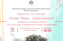 Хөрмәтле әти-әниләр! Сезне 12 март көнне "Бала - гаилә көзгесе" темасы астында узачак Ата-аналар университетына чакырабыз. Уткәрү урыны: З.Басыйрова исемендәге мәдәният йорты. Башлана: 18.00.