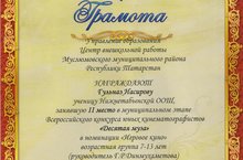 Ученица 3 класса Насирова Гульназ участвовала во Всероссийском конкурсе юных кинематографистов "Десятая муза" в номинации "Игровое кино" заняла в муниципальном этапе II место. Руководитель Динмухаметова Гульназ Раисовна.Поздравляем!!!