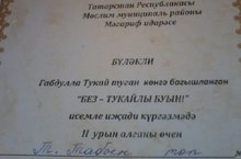 26 апрель Бөек шагыйрь Габдулла Тукайның тууына 131 еллыгына багышланган районара "Без - Тукайлы буын!" дип исемләнгән күргәзмәдә катнашып безнең мәктәп 2 урын алды. Күргәзмәдә "ЗD принтерда" Г.Тукай иҗатына багышлап ясалган эшләр белән катнаштык. Фәрит Өлфәтовичка рәхмәтебезне белдерәбез!!!