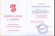 ОАО «Концерн Росэнергоатом» учредил олимпиаду школьников «Олимпиада атомных станций», которая в 2012/13 учебном году проводился в пятый раз. В олимпиаде можно участвовать заочно. Ученик 9 класса нашей школы Кияметдинов Самат был участником этой олимпиады по физике и награжден Дипломом I степени. Пожелаем Самату дальнейших успехов! К олимпиаде его подготовил учитель физики Зарипов Р.