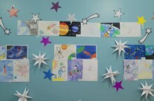 Укучыларыбызның космонавтика көненә багышланган рәсемнәреннән күргәзмә.