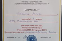27 декабря ученик 4 класса Хабибуллин Альмир участвовал в зональном туре муниципального конкурса "Ученик года" среди учащихся 4-х классов, который прошел на базе Муслюмовской гимназии. Много испытания надо было преодолеть юным участникам - интеллектуальный конкурс и конкурс "Артист". Так интеллектуалы должны были показать свой кругозор, умение ответить на неожиданные вопросы; умение быстро и правильно считать, грамотно писать.