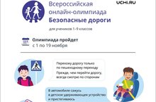 В рамках национального проекта «Безопасные качественные дороги» Минтранс России и МВД России совместно Министерством просвещения РФ и АНО «Национальные приоритеты» проводят Всероссийскую онлайн-олимпиаду для школьников 1-9 классов «Безопасные дороги» на знание основ безопасного поведения на дорогах. Олимпиада пройдет на образовательной платформе Учи.ру с 1 по 19 ноября 2021 года. Участие в Олимпиаде БЕСПЛАТНОЕ. Для прохождения Олимпиады необходимо иметь компьютер или планшет с современным браузером и выходом в Интернет. Выполнять задания можно в домашних условиях при возможном участии родителей.