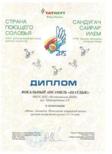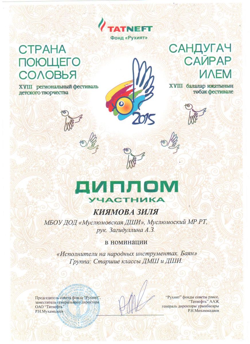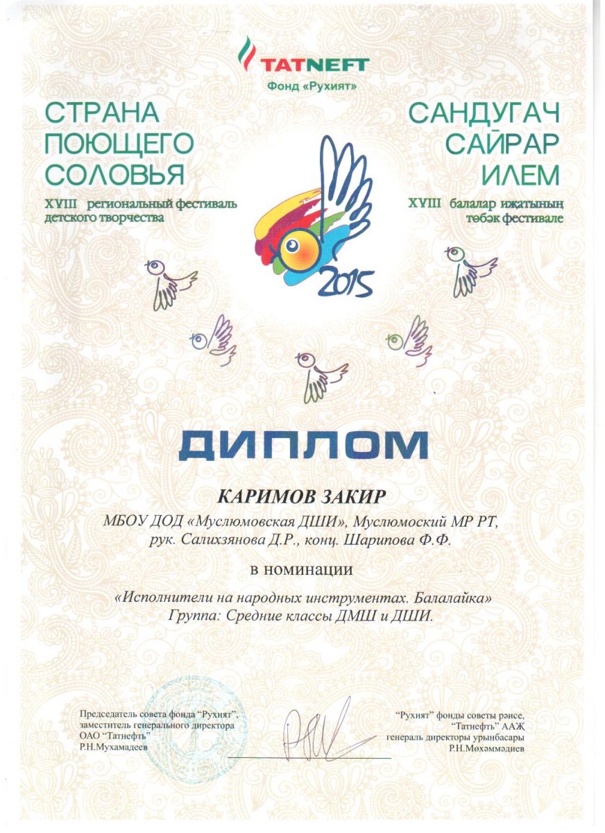 Каримов Закир. Диплом XVIII регионального фестиваля детского творчества "Страна поющего соловья".