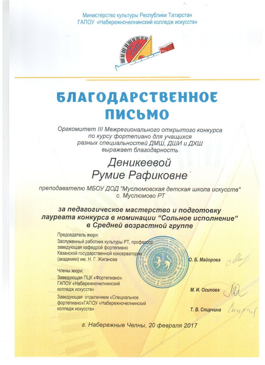 Деникаева Румия Рафиковна. Благодарственное письмо оргкомитета III  Межрегионального Открытого конкурса по курсу фортепиано для учащихся разных специальностей ДМШ, ДШИ и ДХШ
