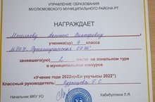 Стали известны результаты муниципального тура республиканской олимпиады школьников по русскому языку. Садриев Д., учащийся 7 класса стал призером, готовила Джамиля к олимпиаде Новикова Н.Г., учительница русского языка