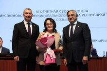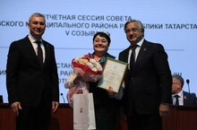 Бүген, район Советының отчет сессиясендә, Васил Шәйхразиев хезмәттәшебез Гөлчәчәк Минсалиховнага Атказанган укытучы дигән мактаулы исемне һәм медаль тапшырды.