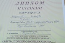 В городе Нижнекамск прошла VII республиканская конференция исследовательских краеведческих работ "Жить, помня о корнях своих...", где ученица 10 класса Газымова Илюза удостоилась Диплома II степени в номинации "Родословие". Руководитель - Асадуллина Йолдыз Раисовна. Поздравляем!!!
