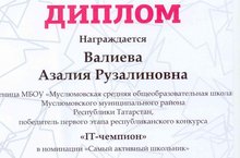 9 февраля ученица 3б класса Валиева А.Р. была приглашена на церемонию награждения победителей республиканского конкурса "IT чемпион" в г.Иннополис. Она была награждена ценным подарком в номинации "" Самый активный школьник. Поздравляем!!!