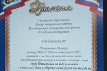 4 нче сыйныф укучысы Шәяхмәтова Мәликә «Су буенда һәм боз өстендә сак булам!» Республикакүләм рәсем конкурсының муниципаль этабында 1 нче урынга лаек булды.