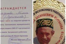Награждается Гильфанова А.Р., занявшая Iместо на открытом турнире по армрестлингу Балтасинского муниципального района. В честь памяти Заслуженного работника физической культуры РТ Рената Бурганова. -