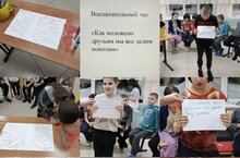Сегодня с нашими воспитанниками проведён воспитательный час на тему: "Как положено друзьям , мы всё делим пополам".С целью формирования у детей представлений о дружбе , взаимопомощи и умении справедливо распределять обязанности и развивать навыки общения и взаимодействия в группе.